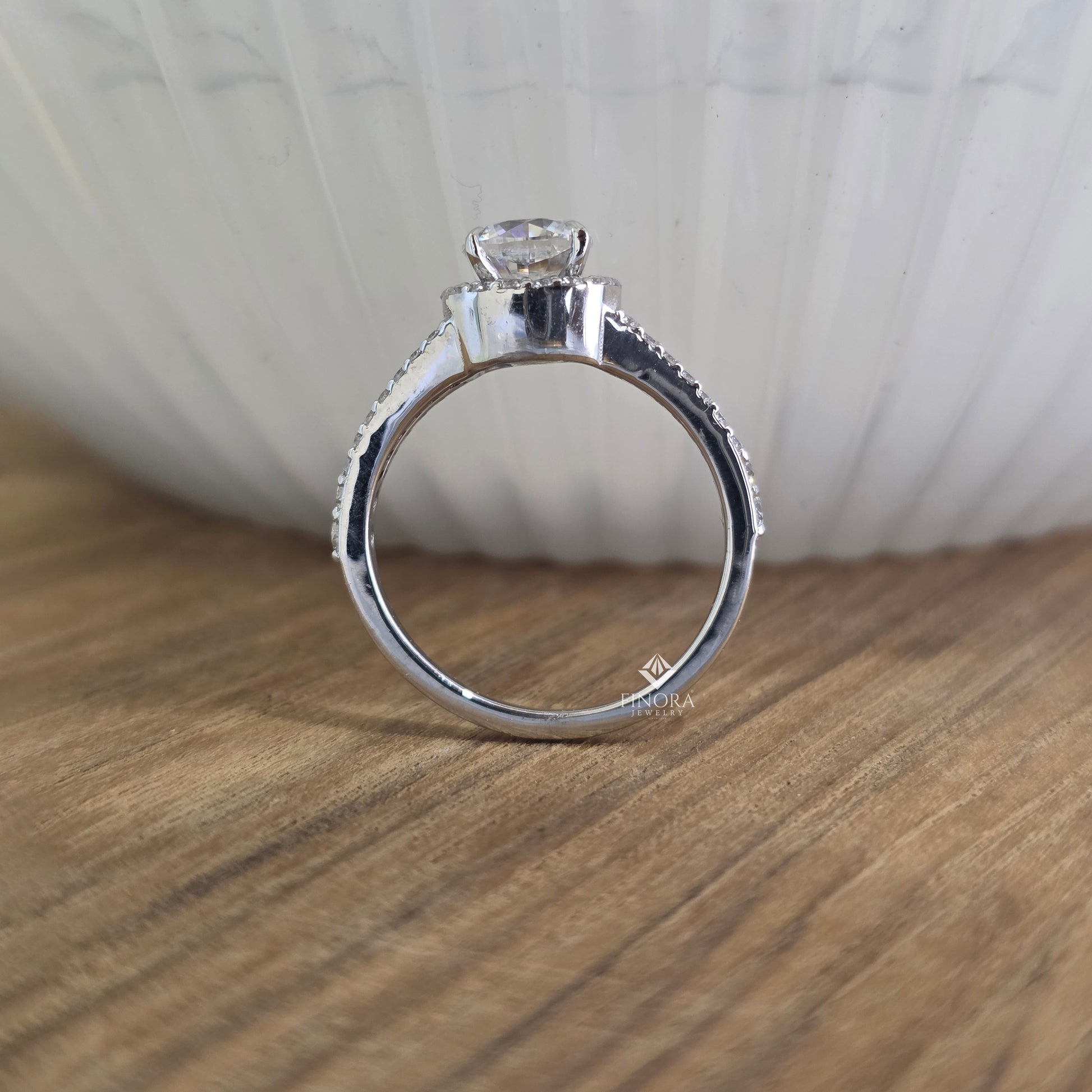 The refined split shank band, delicately adorned with pavé-set moissanite stones, adds depth, sophistication, and a luxurious finish—making this ring a perfect choice for engagements, anniversaries, proposals, or milestone celebrations.