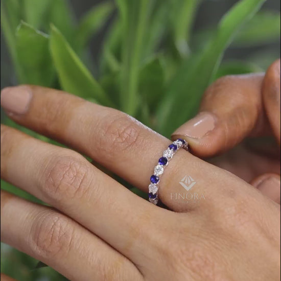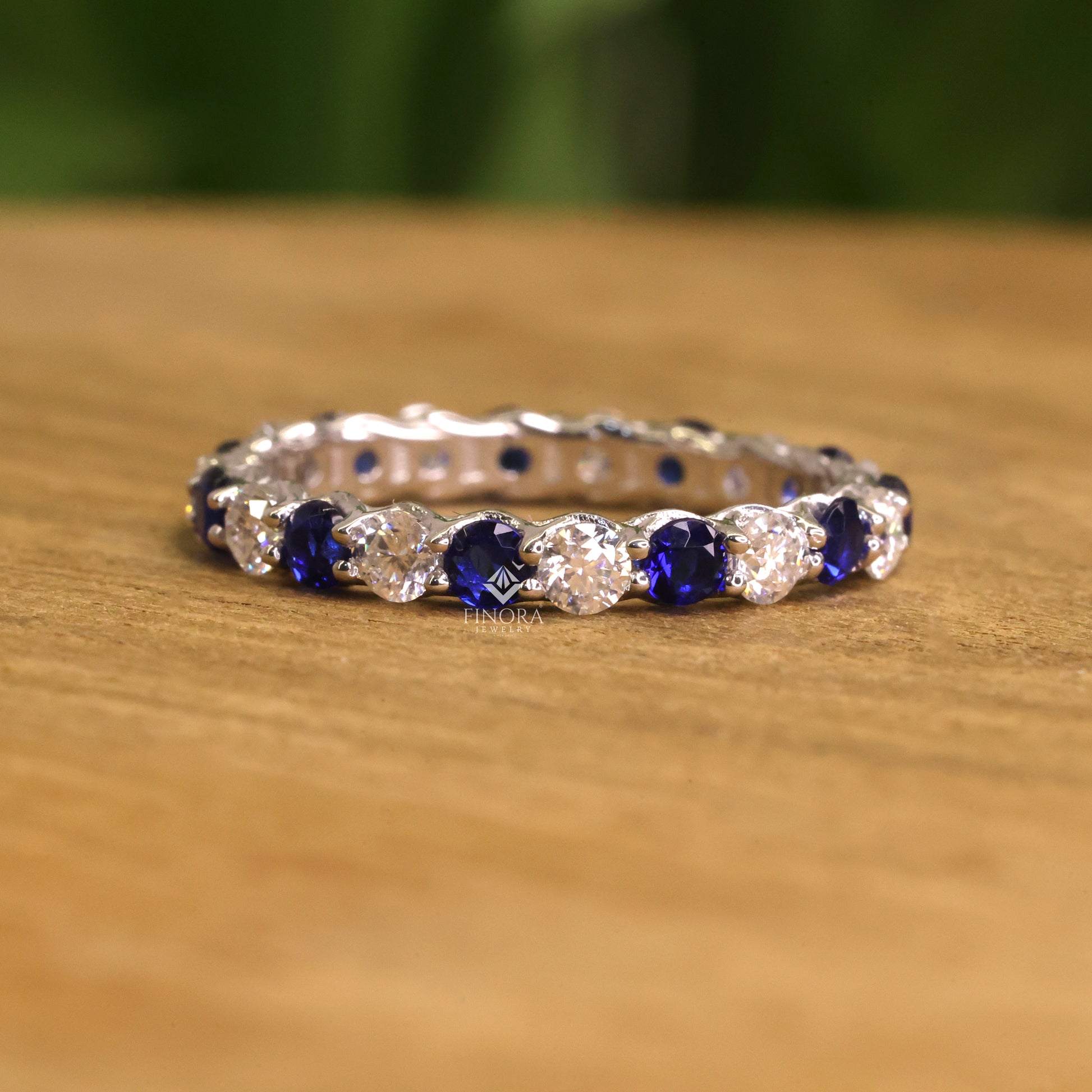 Blue & Colorless Round Cut Moissanite Full Eternity Wedding Band, Stackable Ring – Finora Jewelry