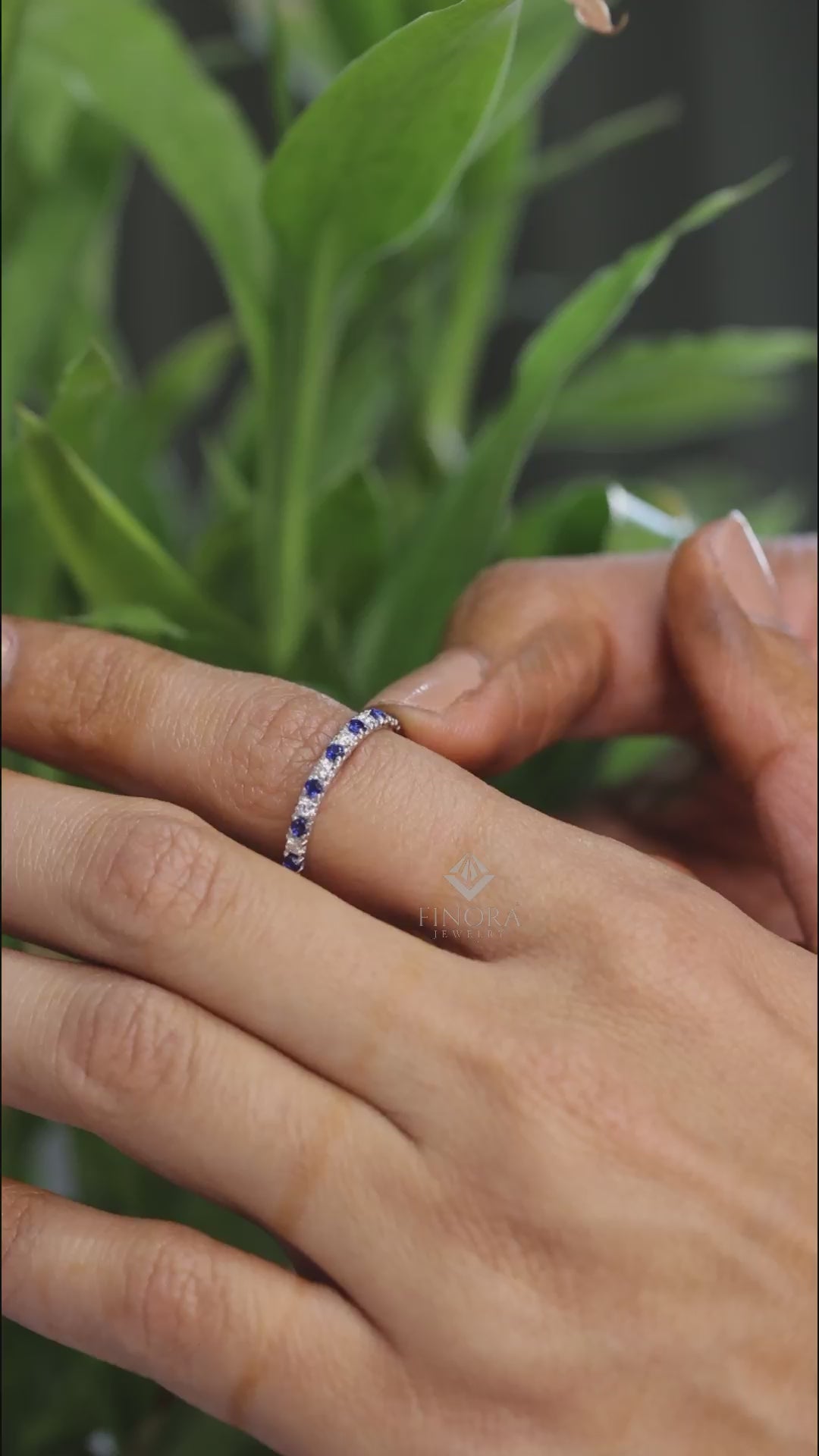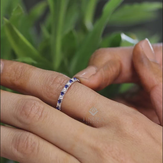 Blue & White Round Cut Moissanite Half Eternity Wedding Band, Stackable Ring – Finora Jewelry