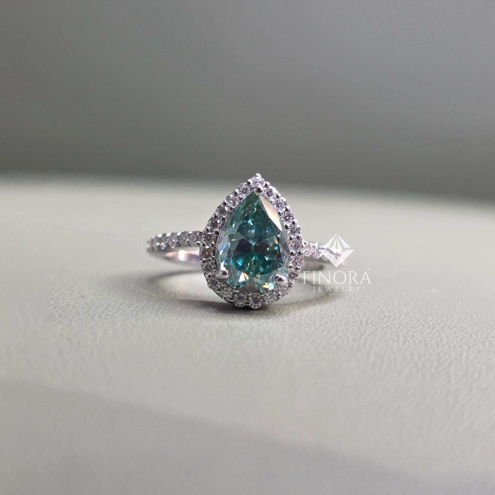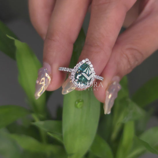 Make a striking and sophisticated statement with this Cyan Blue Pear Cut Moissanite Halo Engagement Ring by Finora Jewelry. Featuring a vivid pear-shaped cyan blue center stone, this design captures attention with its mesmerizing color and exceptional brilliance. The center stone is elegantly framed by a halo of sparkling round-cut moissanite, enhancing both size and radiance.