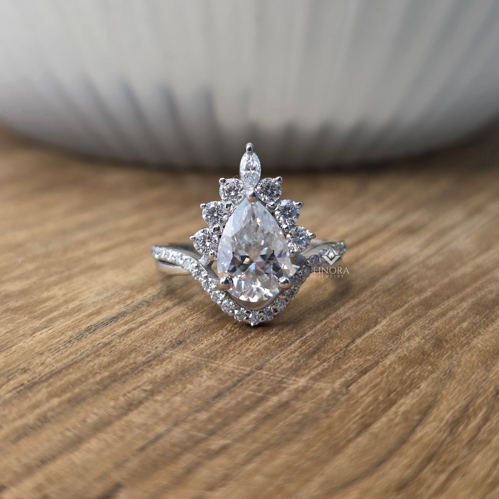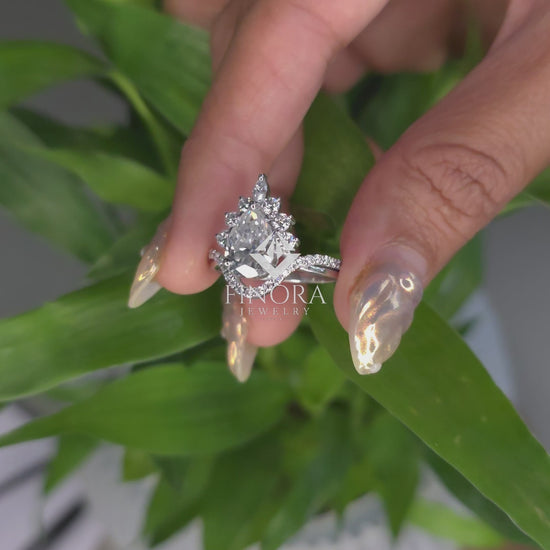 Make an unforgettable statement with this Pear Cut Moissanite Halo Engagement Ring by Finora Jewelry, designed to radiate brilliance from every angle. The elegant pear-shaped center stone is beautifully framed by a floral-inspired halo of marquise and round moissanite side stones, creating a regal yet romantic silhouette.