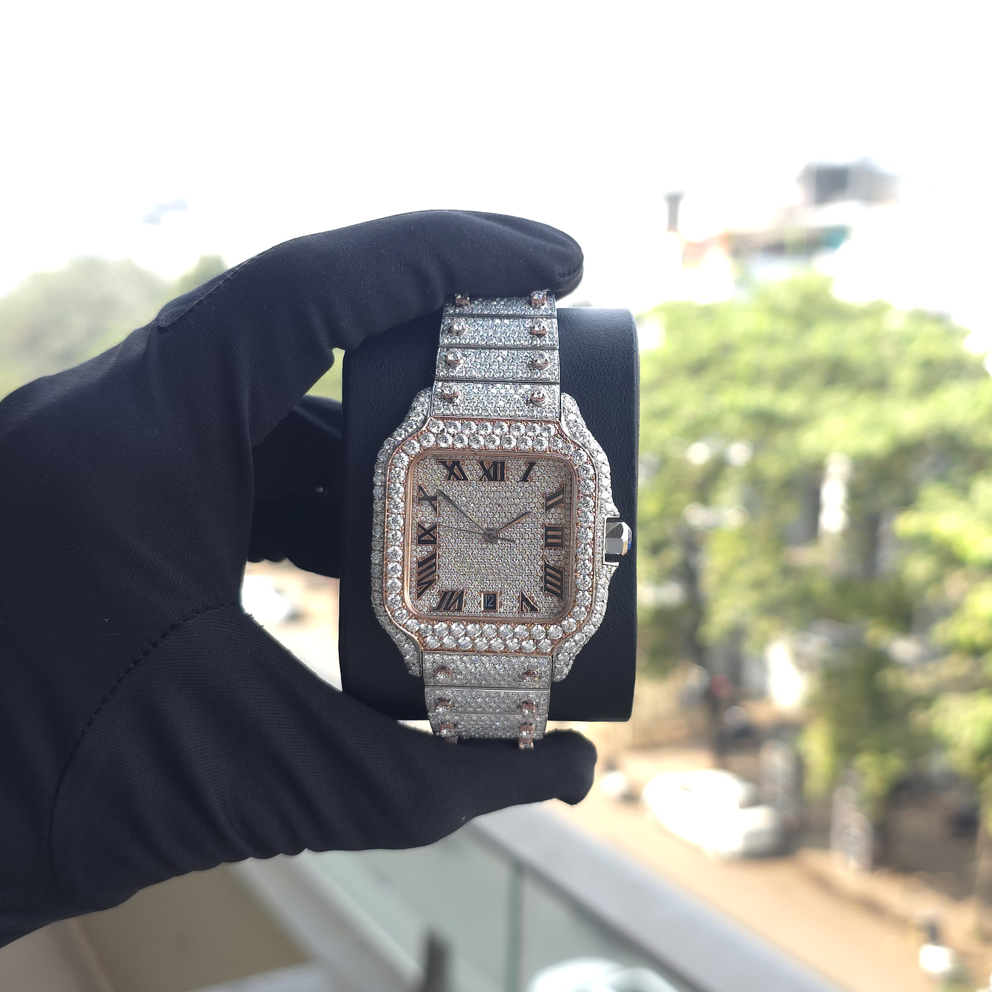 The dial features classic Roman numeral hour markers, beautifully set against a fully paved face that enhances depth and shine. The rose-tone accents contrast perfectly with the white iced finish, creating a balanced two-tone design that stands out without overpowering.