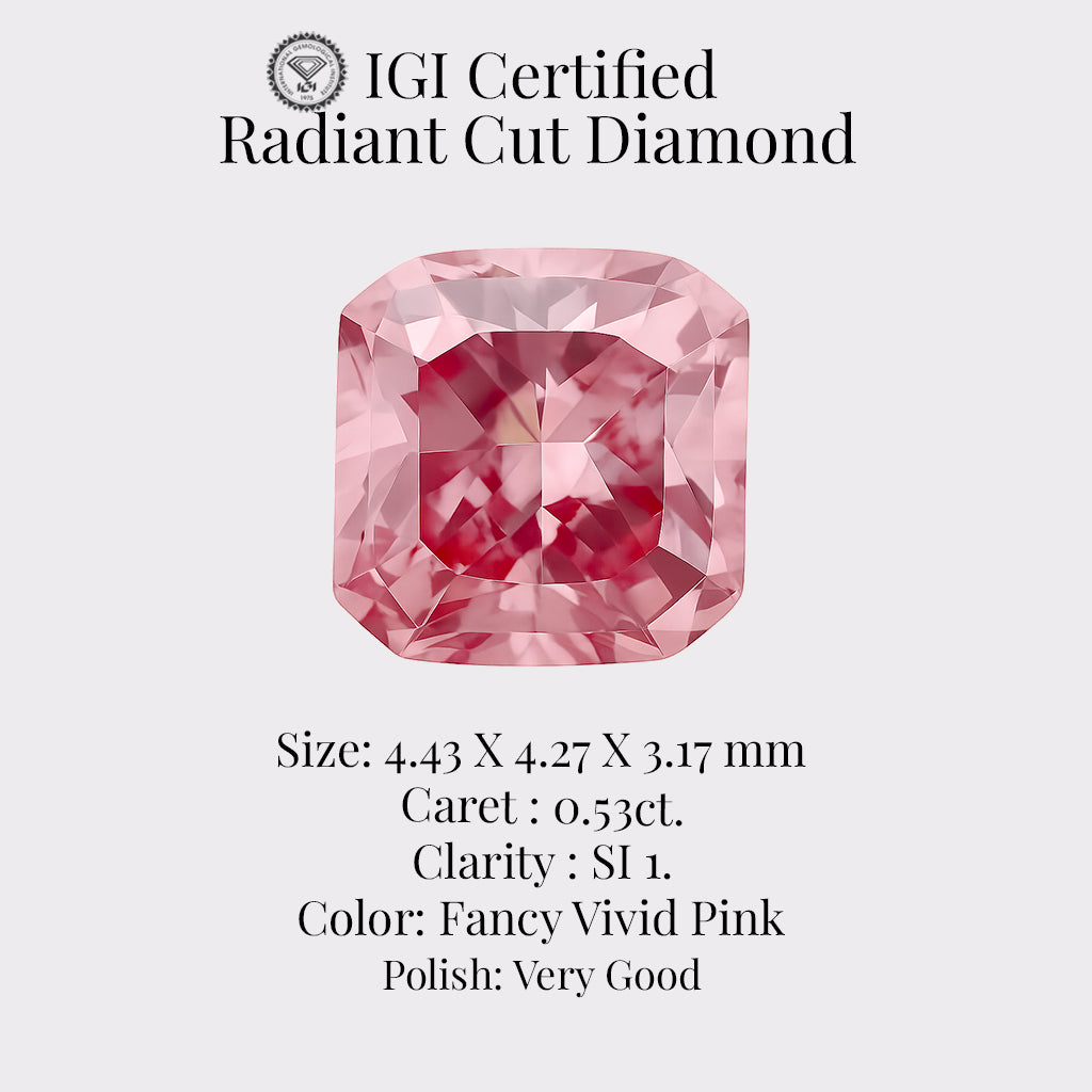 This exquisite Radiant Cut 0.53 Ct Fancy Vivid Pink Diamond is IGI Certified and crafted with precision to showcase exceptional brilliance. With a clarity grade of SI1 and a polish rated Very Good, this diamond radiates timeless elegance. Perfect for engagement rings, milestone anniversaries, or luxury custom jewelry, it is a symbol of beauty and rarity.